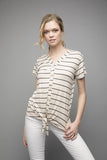 A short sleeve top featuring stripe rayon spandex fabric, button down closure, and front hem tie.