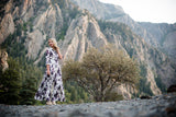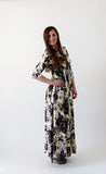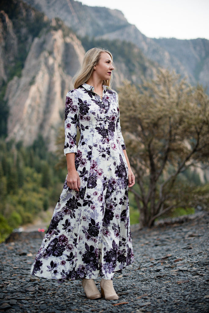3/4 sleeve floral button-up dress with a vintage flare! Nursing friendly. The outdoor pictures look more white than the dress is in person. It is an ivory/cream colored dress.