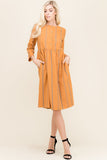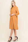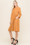 This mustard beauty has buttons up the front (think nursing friendly) and a perfect midi length. We like to pair it with booties and a long cardigan, but it also looks great on it's own!