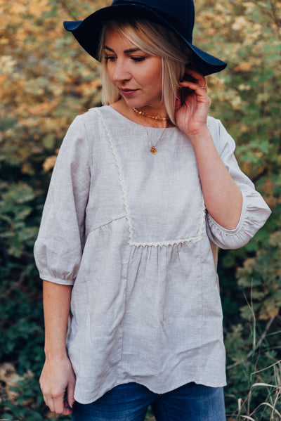 Bubble sleeve top with crochet lace bib detail. Looks great on it's own or layered under your favorite cardigan.
