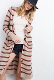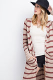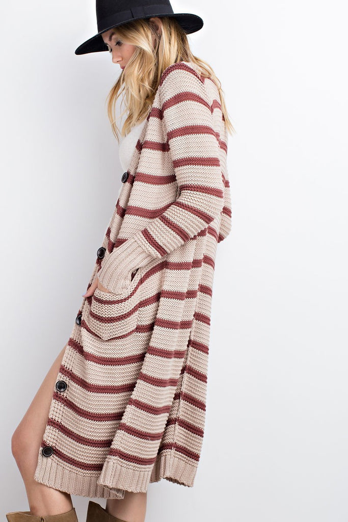 Cozy and stylish all in one sweater. We adore the long fit, big functional pockets (think cell phone storage), rustic buttons, the stripe contrast, stylish seam down the back and the woven texture. This sweater pairs great with jeans and booties or even compliments a simple dress underneath.