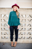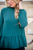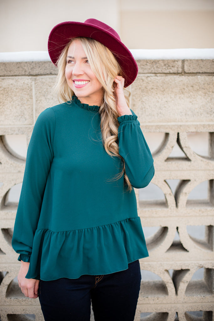The best top of the season. The high ruffle neck + keyhole closure in back + ruffled sleeve cuff + the PERFECT peplum length all combine together to make the most flattering blouse. Looks great with jeans, leggings or even a pencil skirt for something fancy.