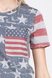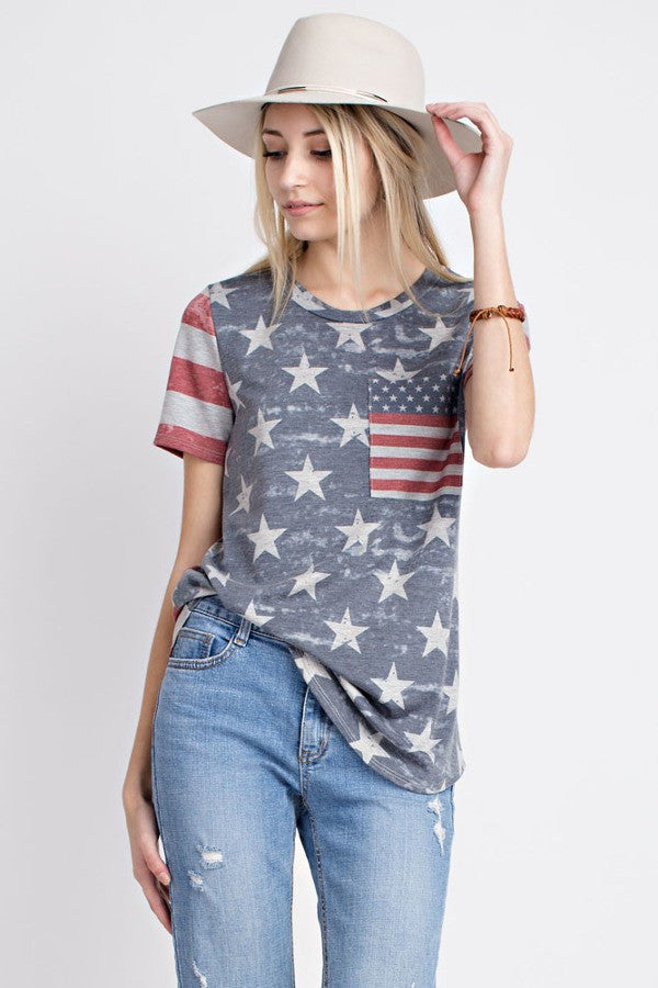 An american flag tee with a heather grey background + pocket + striped sleeves. This tee is perfect for gawking at fireworks!! Mixed print design and super comfy.