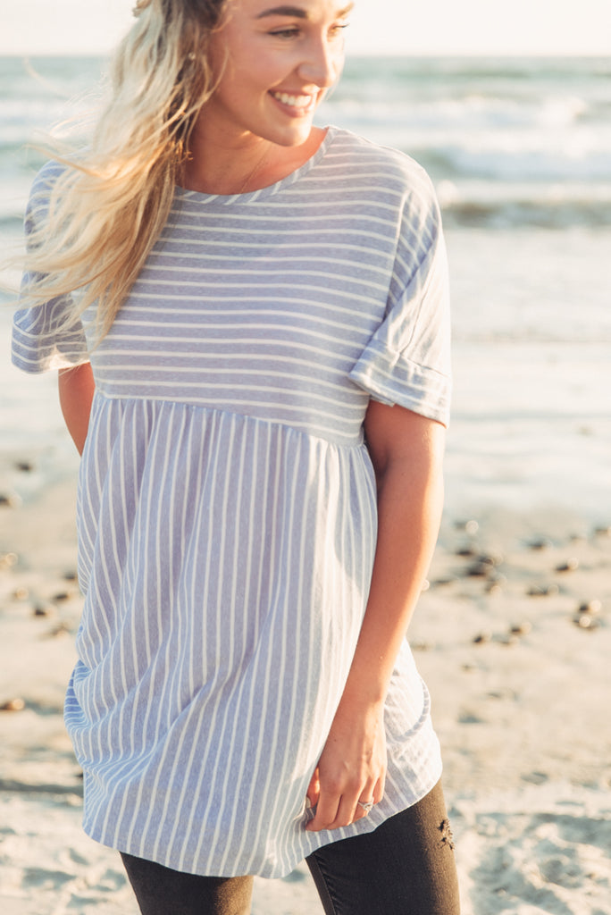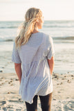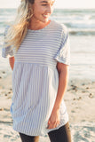 Contrast stripes, long body top in a relaxed fit, short sleeves, a round neck, pleats, and hi-lo hem. This top screams comfort and doesn't look so bad at the beach either. We love the soft fabric and casual fit.